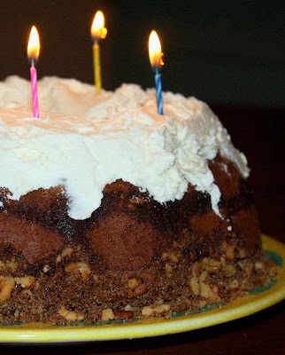 So what better way to get back to my blog than sharing with you a recipe for my favorite birthday cake. This is the cake I ask for most every year. And the cake I sometimes drive 30 minutes for just to have a piece of (it is from one of my favorite vegetarian restaurants up the road a bit). It is THAT good. And its even better the next morning for breakfast with a cup of nice strong coffee. And the best part about it is that it is made with love just for me by the ones that I love the most in this world.